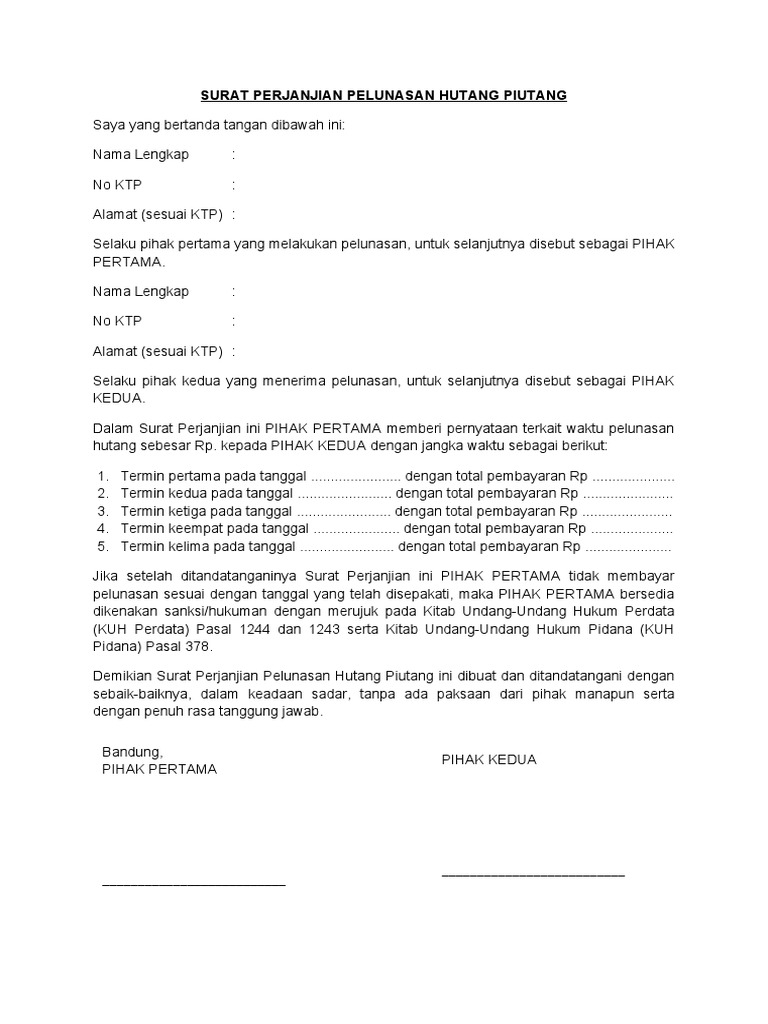 Contoh surat perjanjian arisan yang sah dan benar detiklife. Contoh surat perjanjian hutang piutang di atas materai. Selaku pihak yang melakukan pelunasan, untuk selanjutnya disebut sebagai pihak pertama nama : Ada beberapa contoh perkara yang bisa diatur didalam surat perjanjian antara lain : Contoh surat perjanjian hutang piutang dengan jaminan format 338 x 385 contoh pelunasan utang format 768 x 1024 pixel download doc surat pernyataan pelunasan hutang wanto sahabat format 600 x 988 pixel download form mkt b surat pernyataan pengakuan hutang.