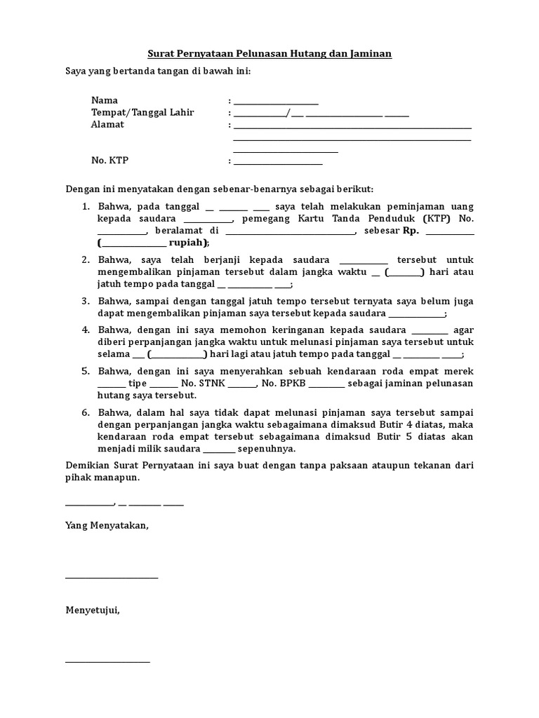 Contoh Surat Keterangan Hutang Lunas Contoh Surat from imgv2-1-f.scribdassets.com Bahwa, dalam hal saya tidak dapat melunasi pinjaman saya tersebut sampai dengan perpanjangan jangka waktu sebagaimana dimaksud butir 4 diatas, maka kendaraan roda empat tersebut sebagaimana dimaksud butir 5 diatas akan menjadi milik saudara _____ sepenuhnya. Contoh surat perjanjian hutang piutang di atas materai. Kesepakatan pelunasan dan penjaminan hutang; Contoh surat perjanjian hutang dan cara membuatnya. Surat pernyataan pelunasan hutang piutang. Contoh surat pernyataan melunasi hutang have an image associated with the other.contoh surat pernyataan melunasi hutang in addition, it will feature a picture of a kind that could be observed in the gallery of contoh surat pernyataan melunasi hutang. Surat perjanjian pelunasan hutang merupakan hastag atau topik khusus untuk mengelompokkan gambar surat perjanjian pelunasan hutang terbaru dari situs kumpulan contoh surat dengan tujuan untuk memudahkan navigasi anda dalam mencari kategori sesuai keinginan. Oleh karena itulah surat perjanjian hutang piutang memiliki peran penting ketika kedua pihak membuat kesepakatan.